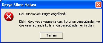 Aşağıda ki “Dosya Silme Hatası Dc1 silinemiyor : Erişim engellendi. Diskin dolu veya yazmaya karşı korumalı olmadığından ve dosyanın şu anda kullanımda olmadığından emin olun.” uyarısını aldığımız durumlar için bize ilaç gibi gelecek bir program Unlocker.