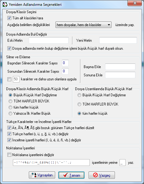 Bu üretilen program dosyalar ve klasörlerde ki Türkçe karakterleri düzenlediği gibi “bul ve değiştir” – “sonuna veya başına metin ekle veya sil” – “büyük harfi küçük, küçük harfi büyük yap” gibi pek çok işleve sahip.